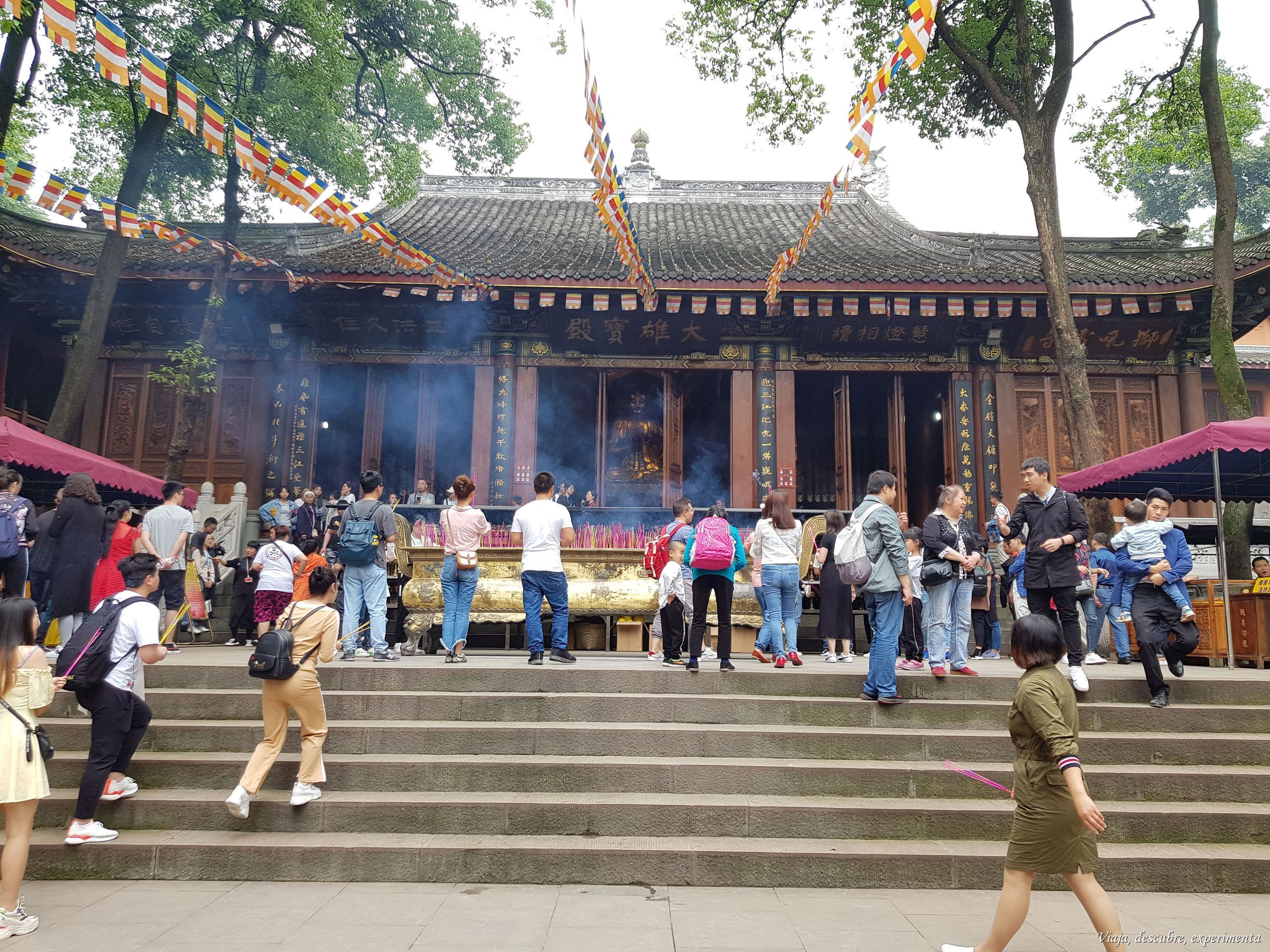 Está en la cima de la montaña del mismo nombre y tiene otro buda de gran tamaño, por lo que también se llama Templo del Buda Gigante (Temple of Giant Buddha). Es impresionante que ya existiera antes que la famosa figura gigante del Buda de Leshan, con lo que cuenta con más de 1300 años. No obstante, aunque fuera construido inicialmente durante la Dinastía Tang, ha sido destruido y vuelto a construir varias veces.