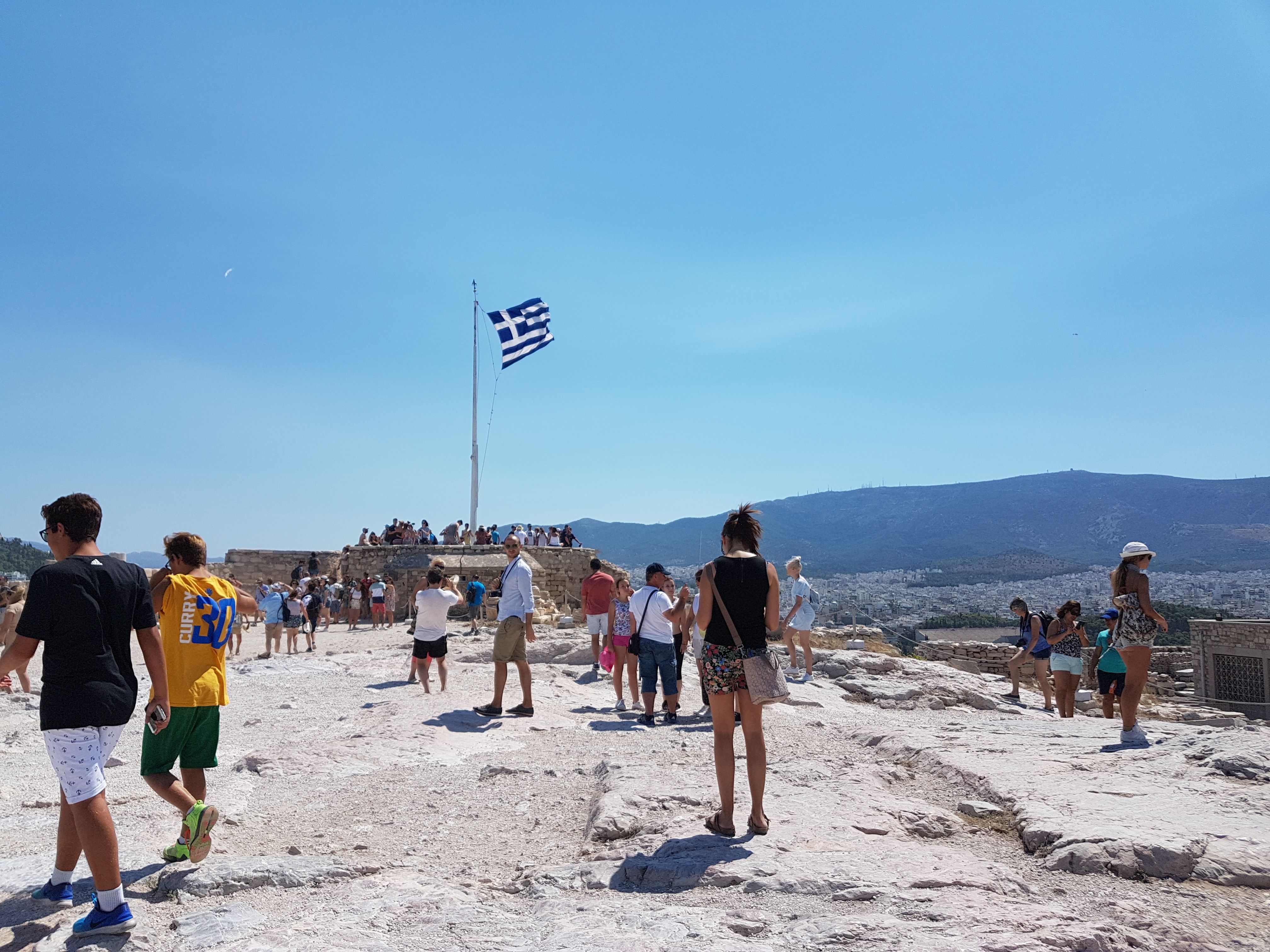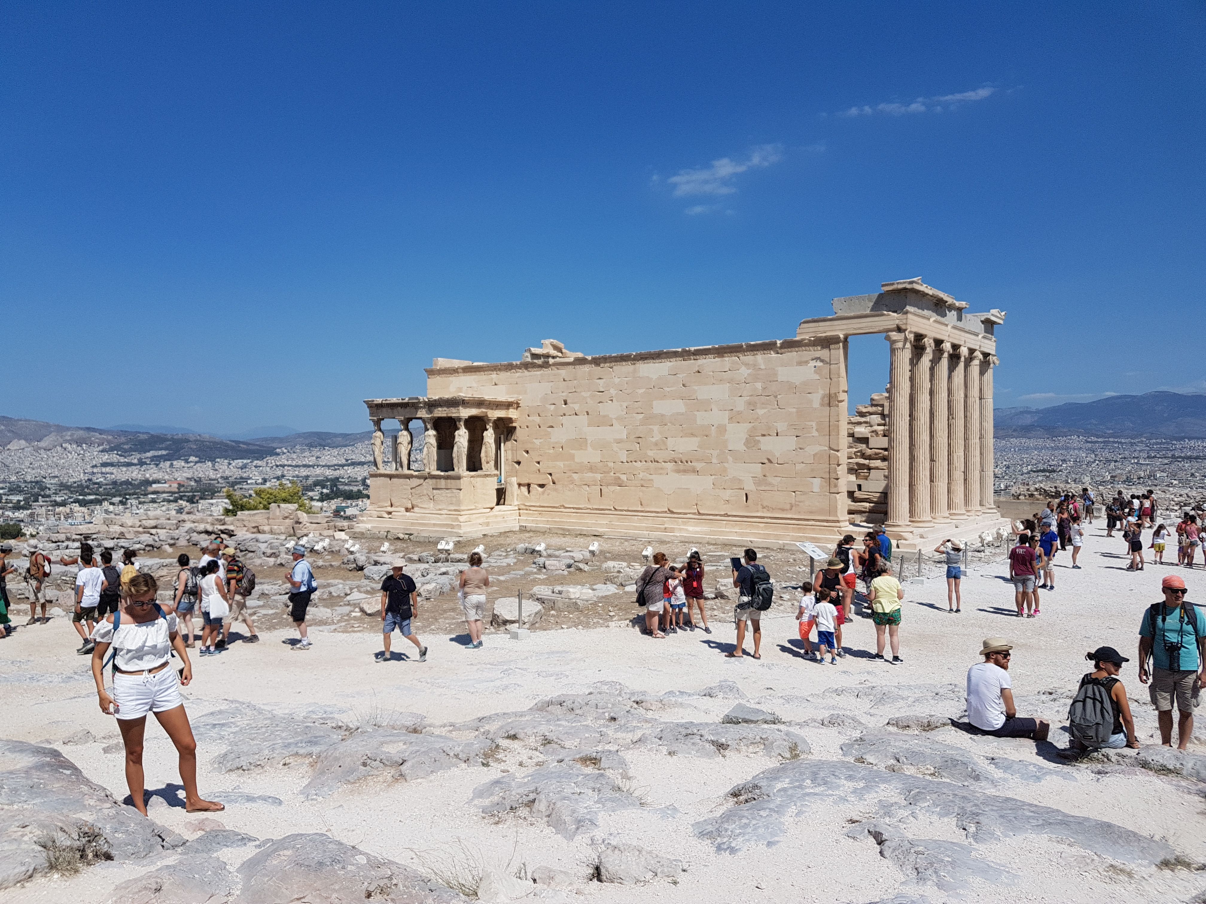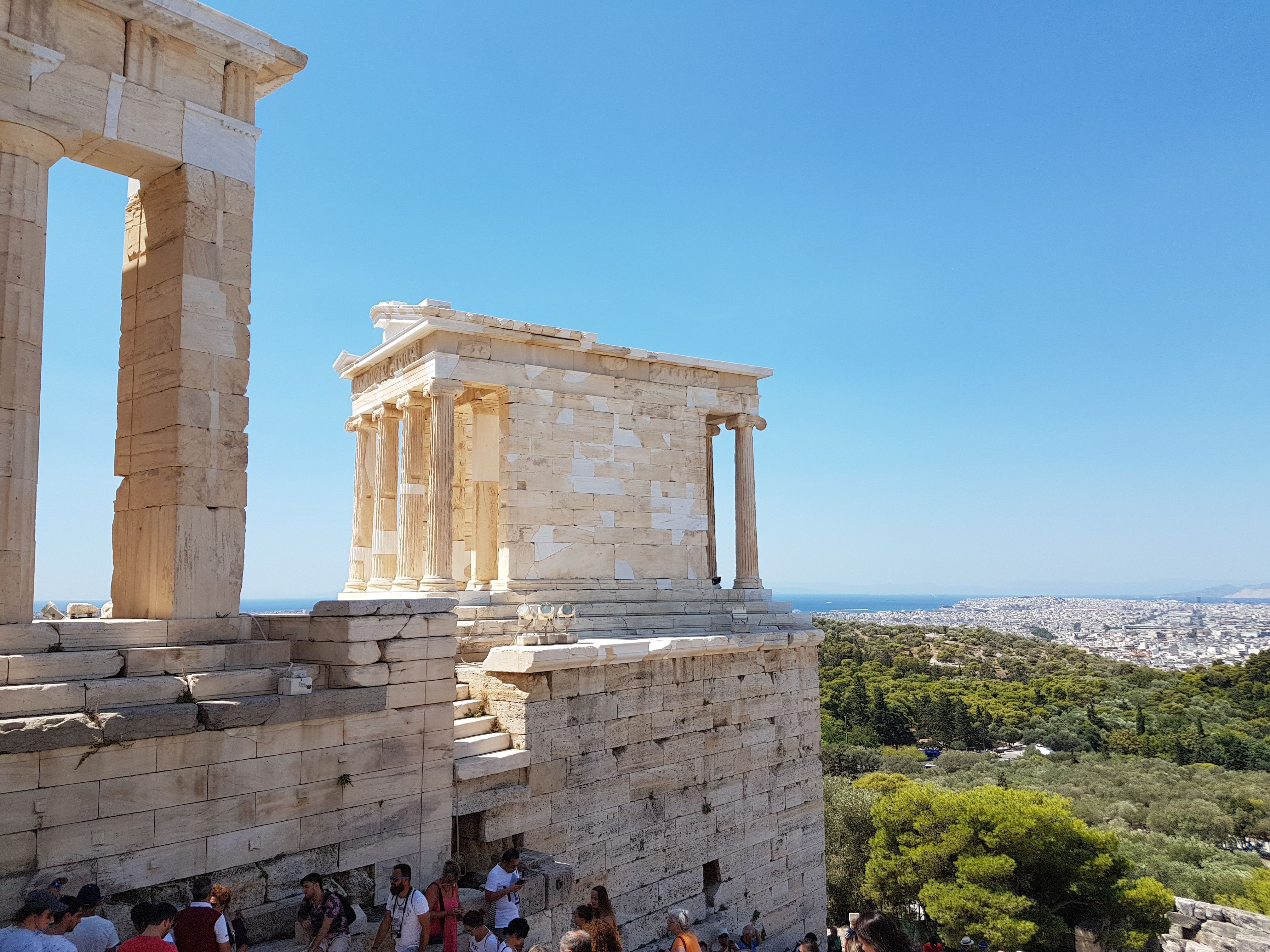 Es la más importante de todas las acrópolis griegas y, sin duda, en la que primero pensamos al escuchar «acrópolis», que sencillamente significa ‘ciudad alta’ (‘en la cima’). Se ve desde buena parte de la capital y está rodeada por todos sus flancos de barrios muy turísticos y comerciales, llenos de restaurantes, bares y tiendas. Tanto de día como de noche supone una vista preciosa, pero cuando oscurece se ilumina y es un verdadero placer subir los paseos que hay en sus costados teniéndola a ella como telón de fondo (por no hablar de sentarse en alguna terraza a sentir el fresco veraniego de la noche -fresco algo relativo, la verdad- mientras se toma una cerveza griega).