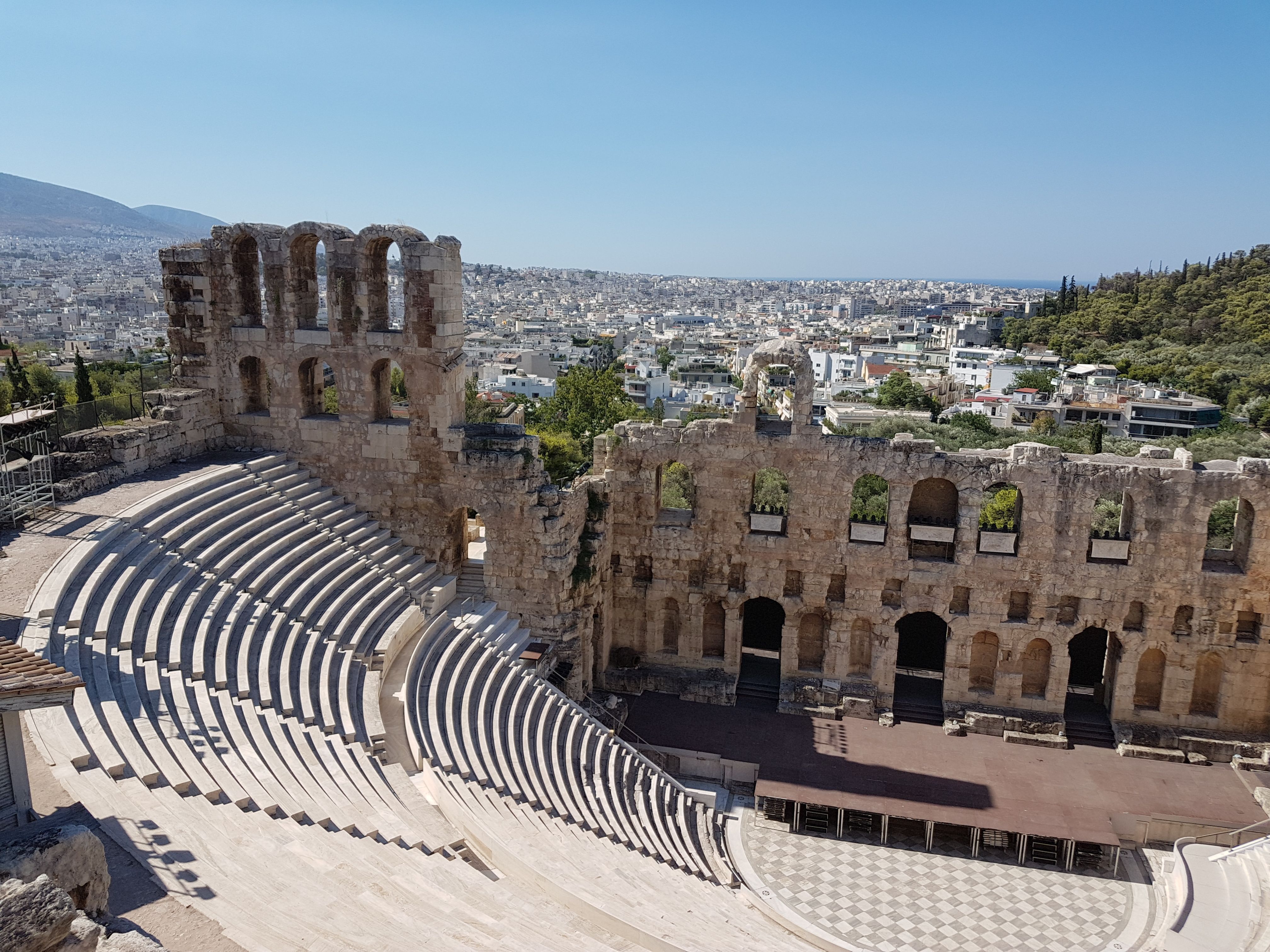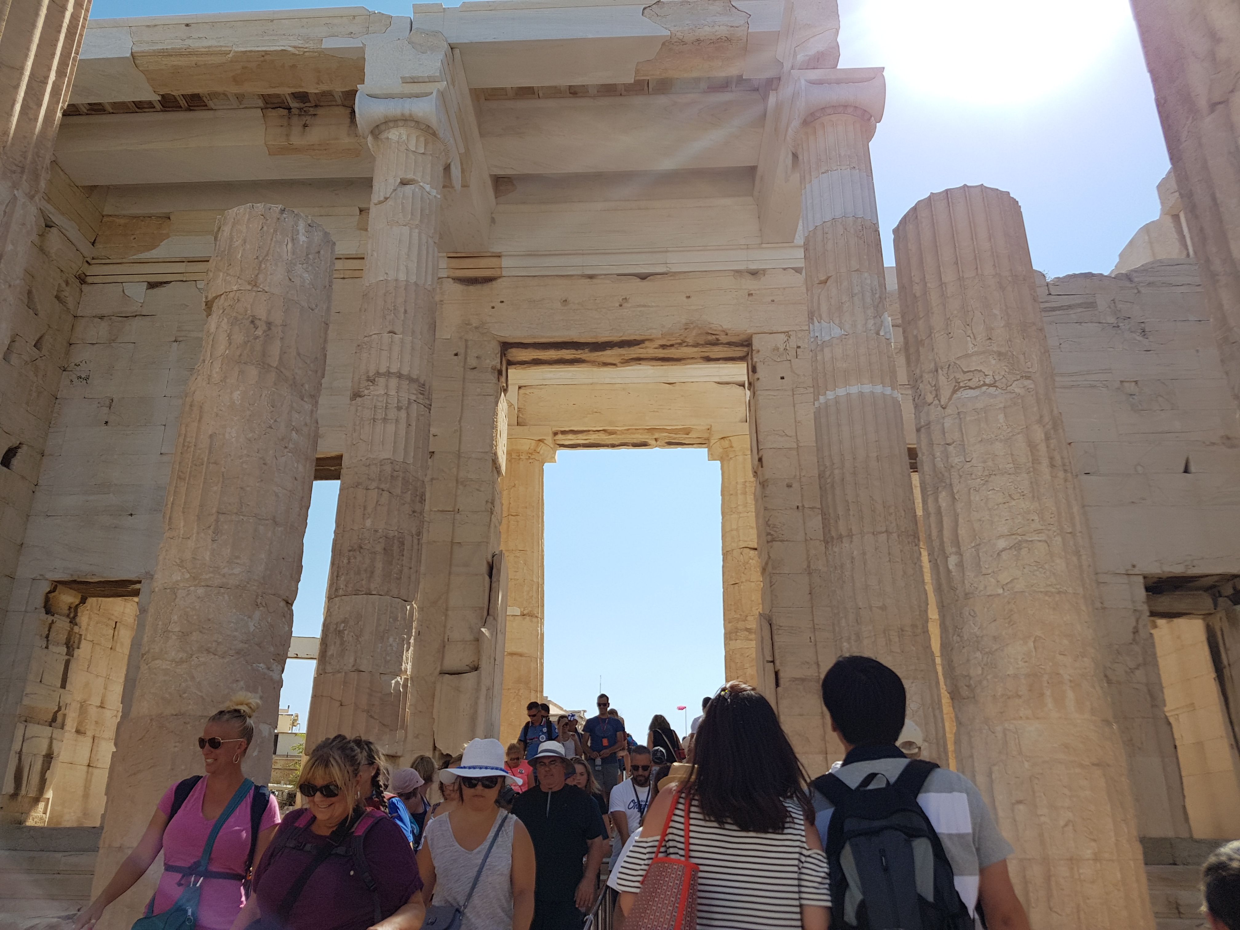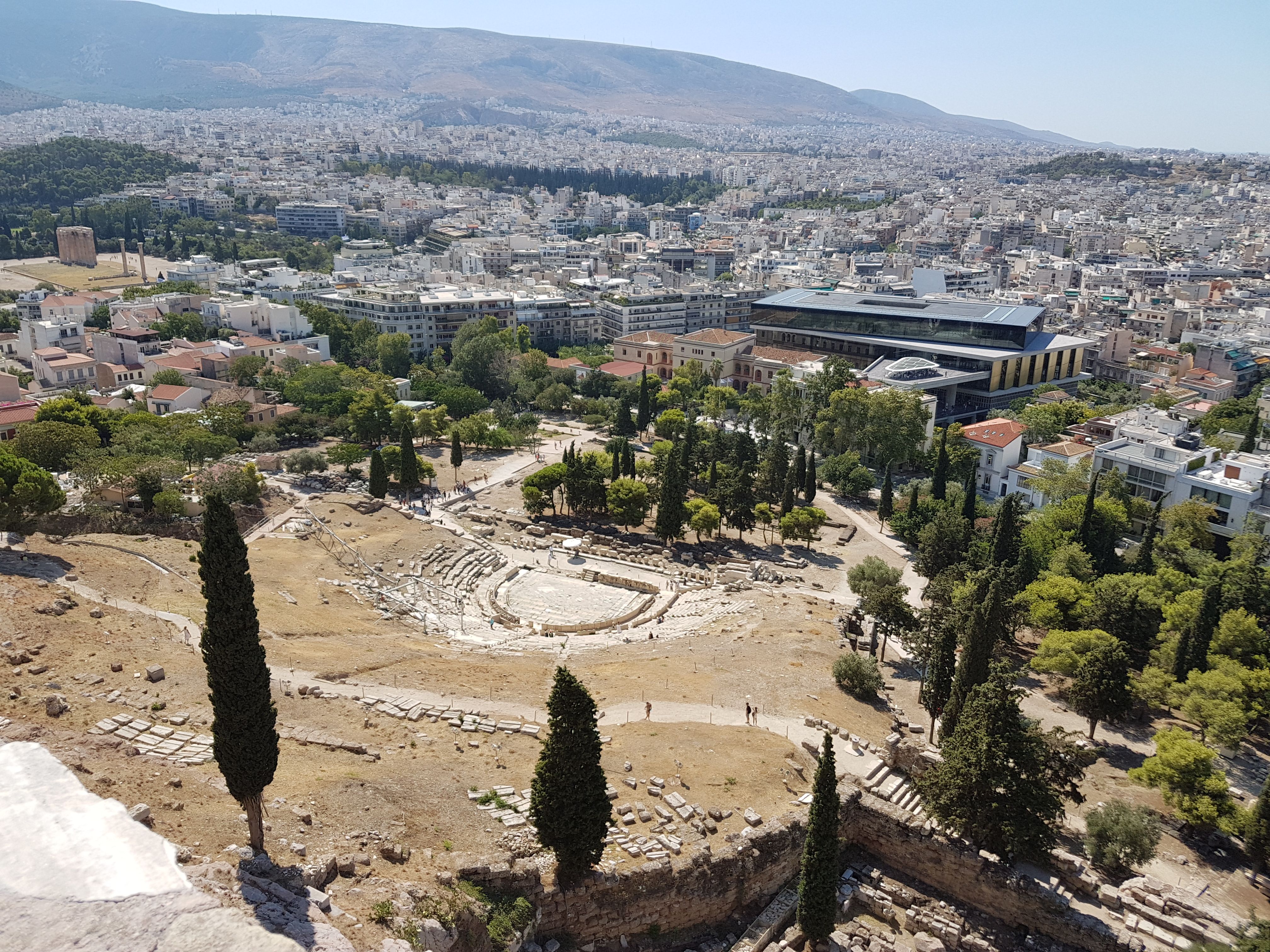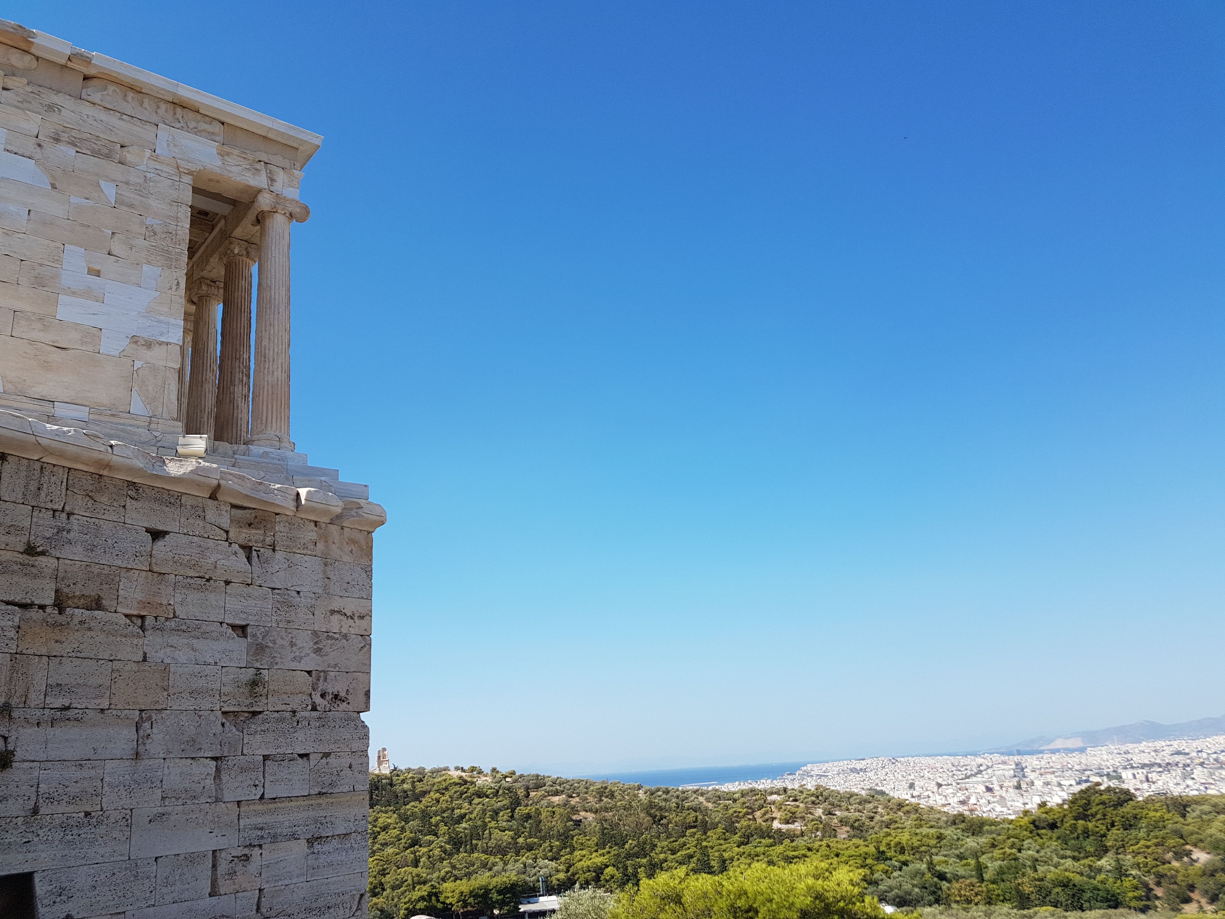 Es la más importante de todas las acrópolis griegas y, sin duda, en la que primero pensamos al escuchar «acrópolis», que sencillamente significa ‘ciudad alta’ (‘en la cima’). Se ve desde buena parte de la capital y está rodeada por todos sus flancos de barrios muy turísticos y comerciales, llenos de restaurantes, bares y tiendas. Tanto de día como de noche supone una vista preciosa, pero cuando oscurece se ilumina y es un verdadero placer subir los paseos que hay en sus costados teniéndola a ella como telón de fondo (por no hablar de sentarse en alguna terraza a sentir el fresco veraniego de la noche -fresco algo relativo, la verdad- mientras se toma una cerveza griega).