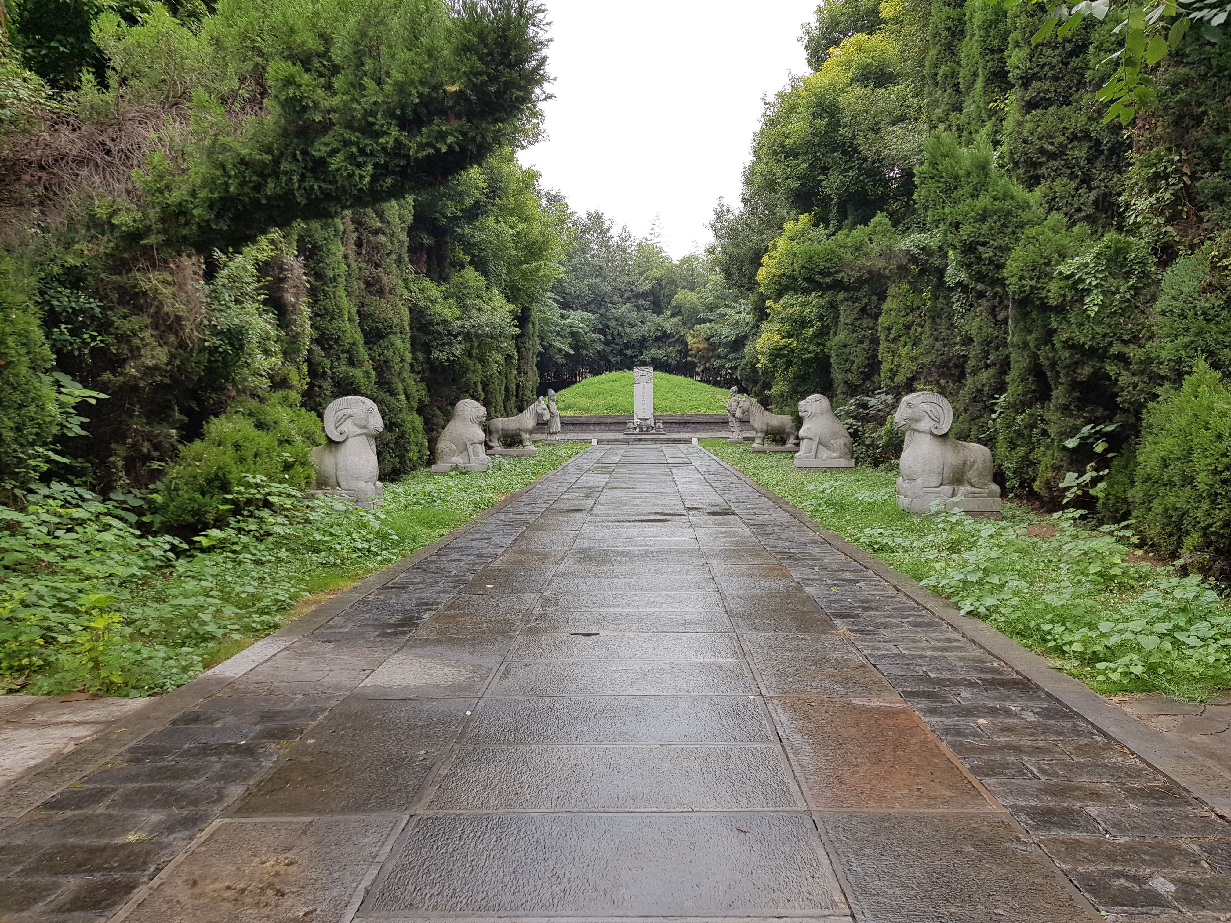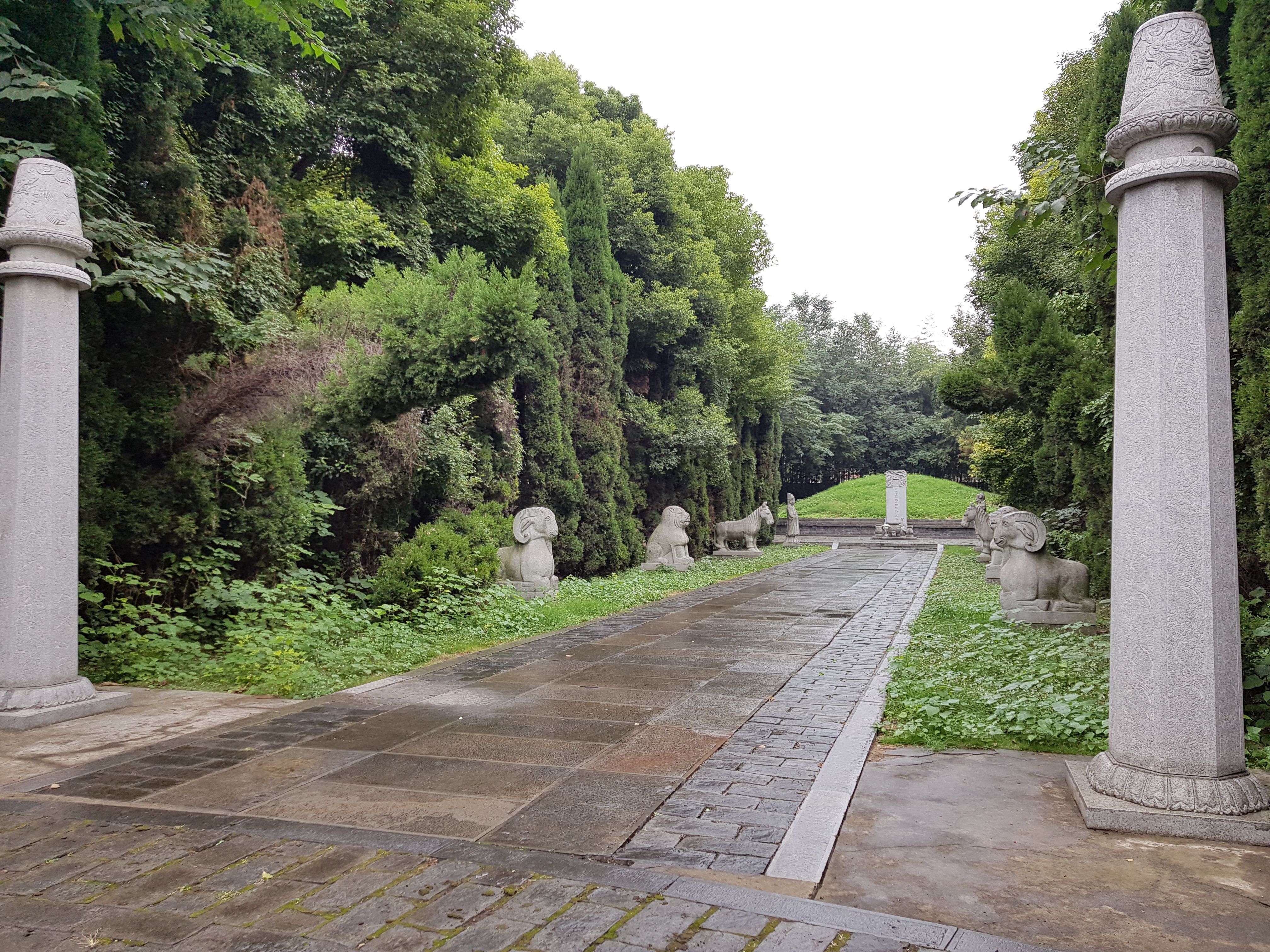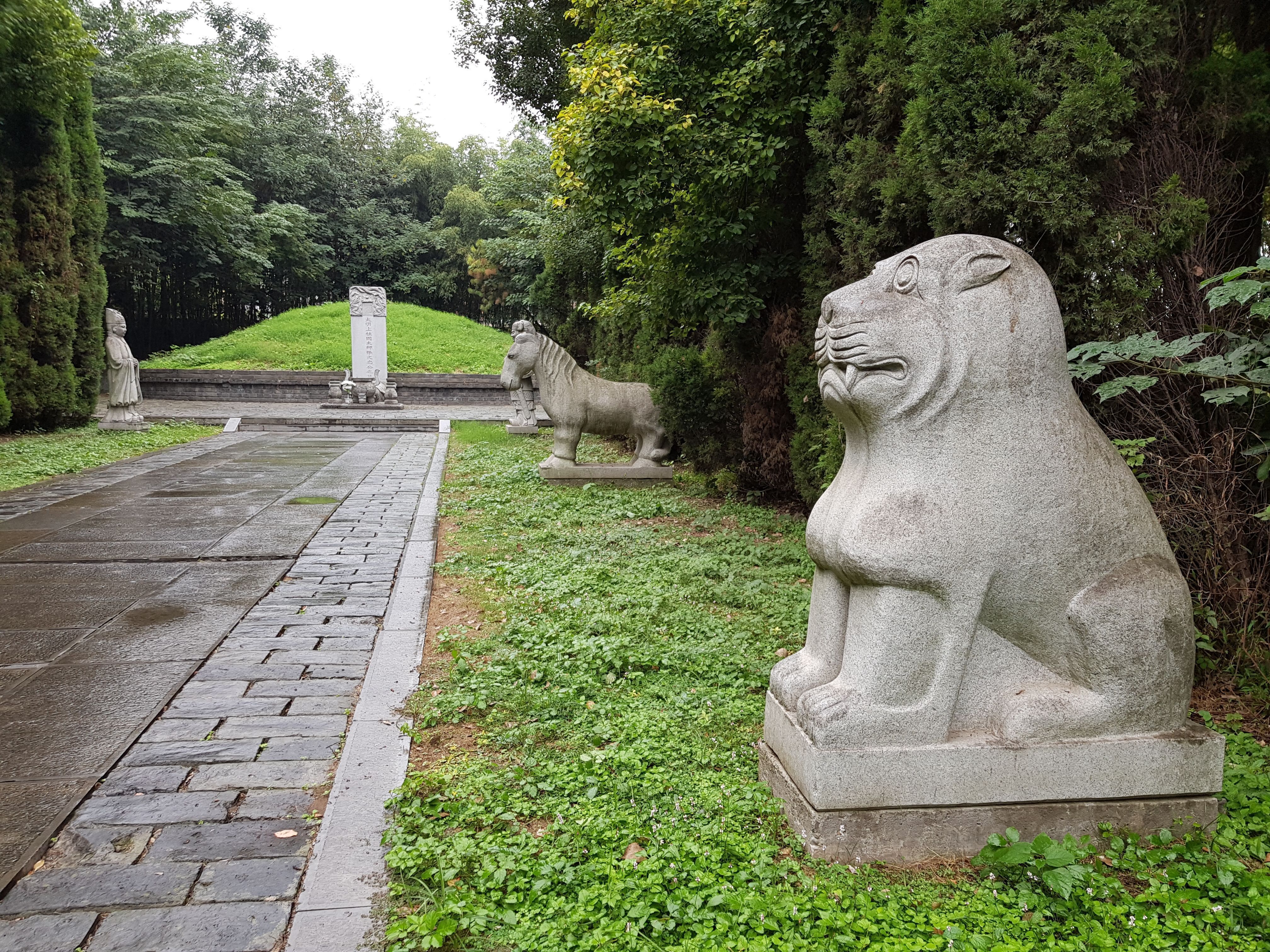 Finalmente, la parte opuesta a la entrada, de aspecto más noble y pretérito por sus estatuas custodiando entre la vegetación, aunque algo descuidada, contiene la razón del memorial: la tumba simbólica de Zhang Ju Zheng. De nuevo, un camino de baldosas (más robustas que las anteriores y de mejor calidad) avanza entre dos flancos presididos por distintas figuras que simbolizan, como contenedoras de espíritus, la protección que recibe lo valioso allí presente: las ropas, y no sé si más pertenencias, del Gran Secretario, enterradas bajo el gran montículo de tierra del fondo, cubierto de césped y rodeado por un pasillo de baldosas. Ante la tumba, vertical, se encuentra su epitafio, que cita sus títulos y su nombre. Al otro lado, como decía, un templo budista. Desde luego, una colocación privilegiada por su estatus social.