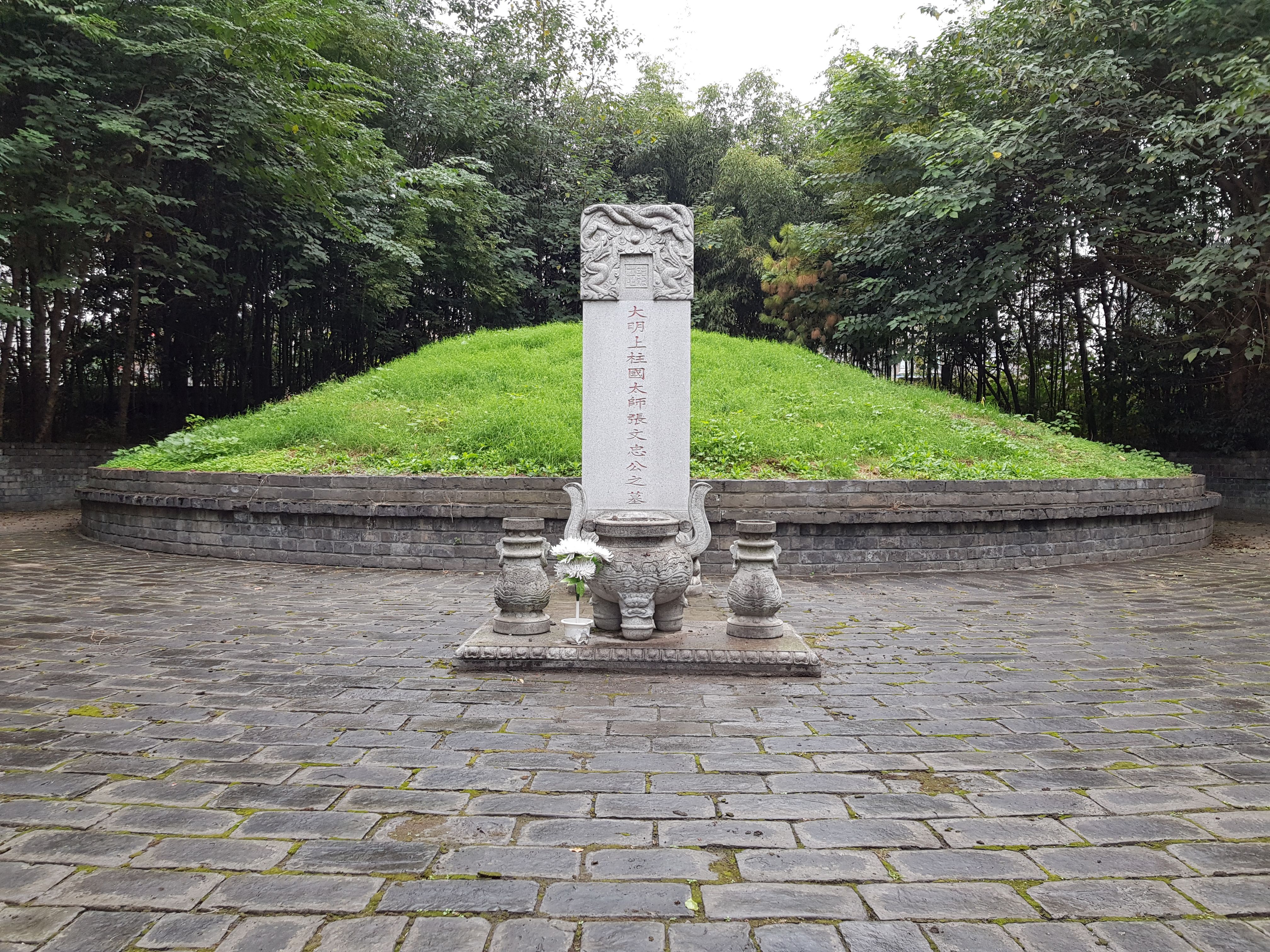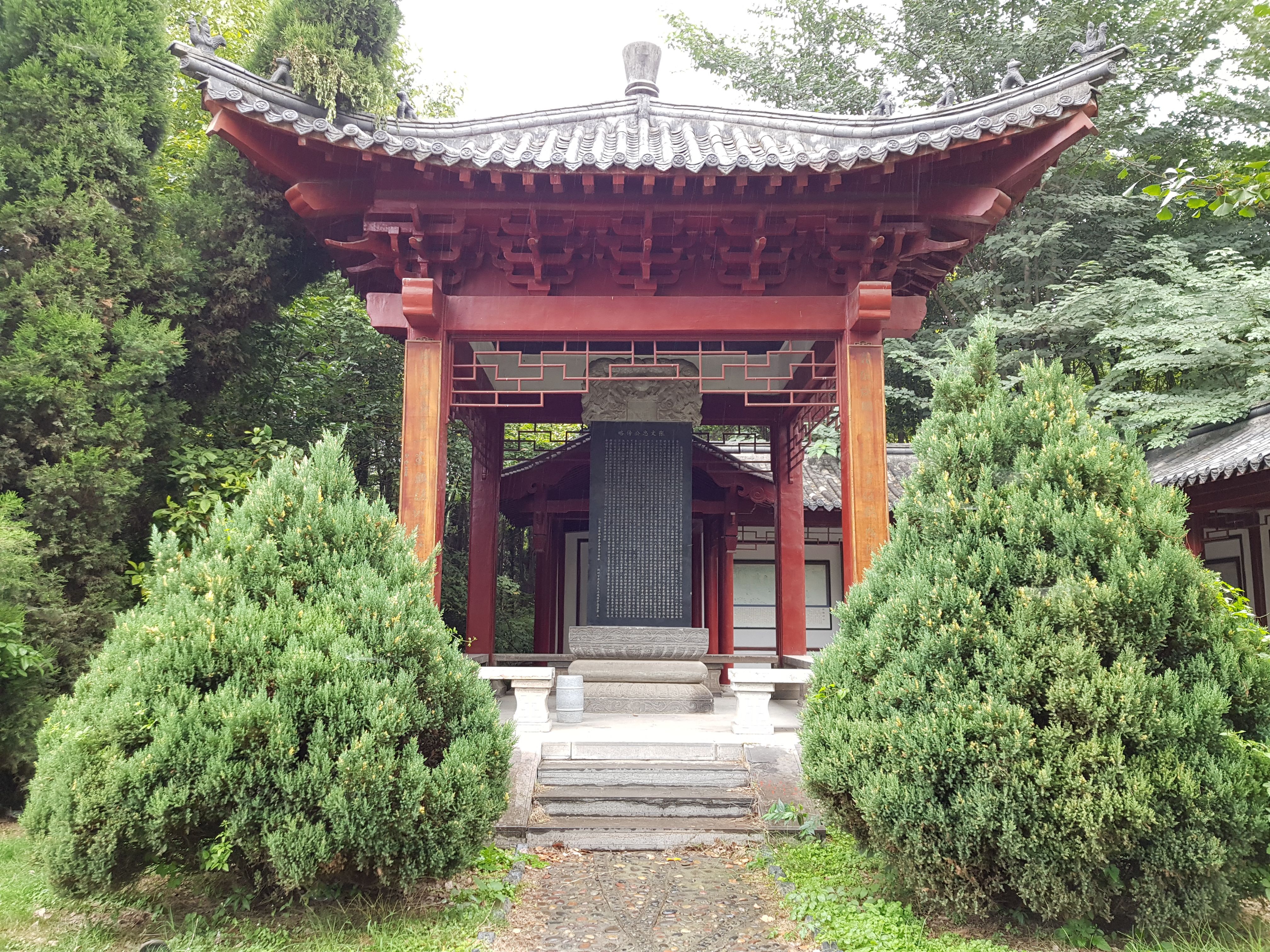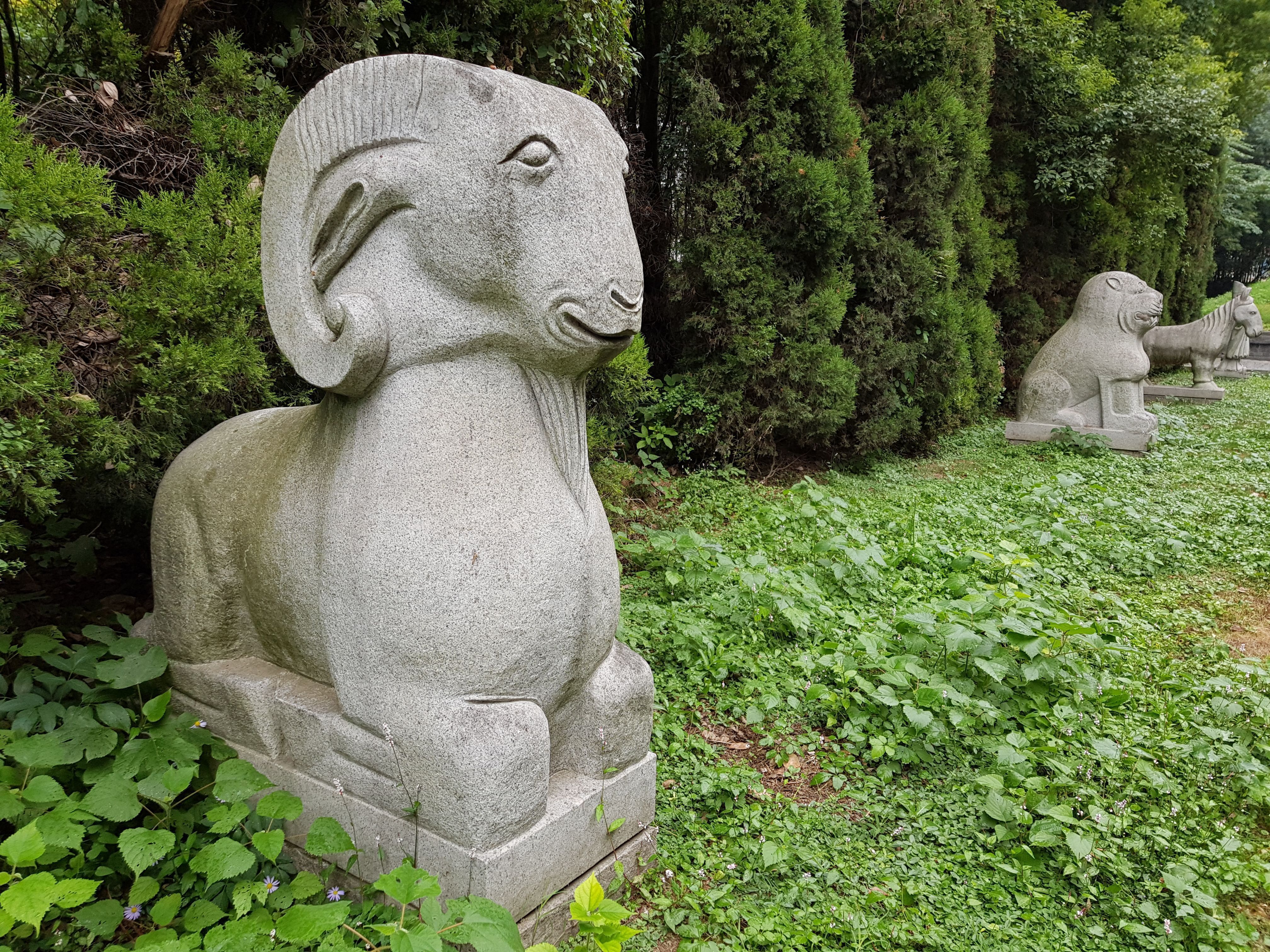 Finalmente, la parte opuesta a la entrada, de aspecto más noble y pretérito por sus estatuas custodiando entre la vegetación, aunque algo descuidada, contiene la razón del memorial: la tumba simbólica de Zhang Ju Zheng. De nuevo, un camino de baldosas (más robustas que las anteriores y de mejor calidad) avanza entre dos flancos presididos por distintas figuras que simbolizan, como contenedoras de espíritus, la protección que recibe lo valioso allí presente: las ropas, y no sé si más pertenencias, del Gran Secretario, enterradas bajo el gran montículo de tierra del fondo, cubierto de césped y rodeado por un pasillo de baldosas. Ante la tumba, vertical, se encuentra su epitafio, que cita sus títulos y su nombre. Al otro lado, como decía, un templo budista. Desde luego, una colocación privilegiada por su estatus social.